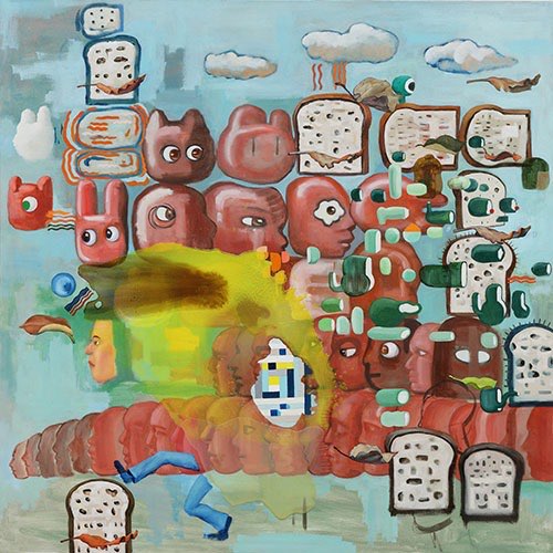 The organic arrangement, heterogeneous motifs, and the repetitively deconstructed figures are illustrated in visual features basis on the artist’s work. There are no distinct personalities of the characters and there is no story between them.