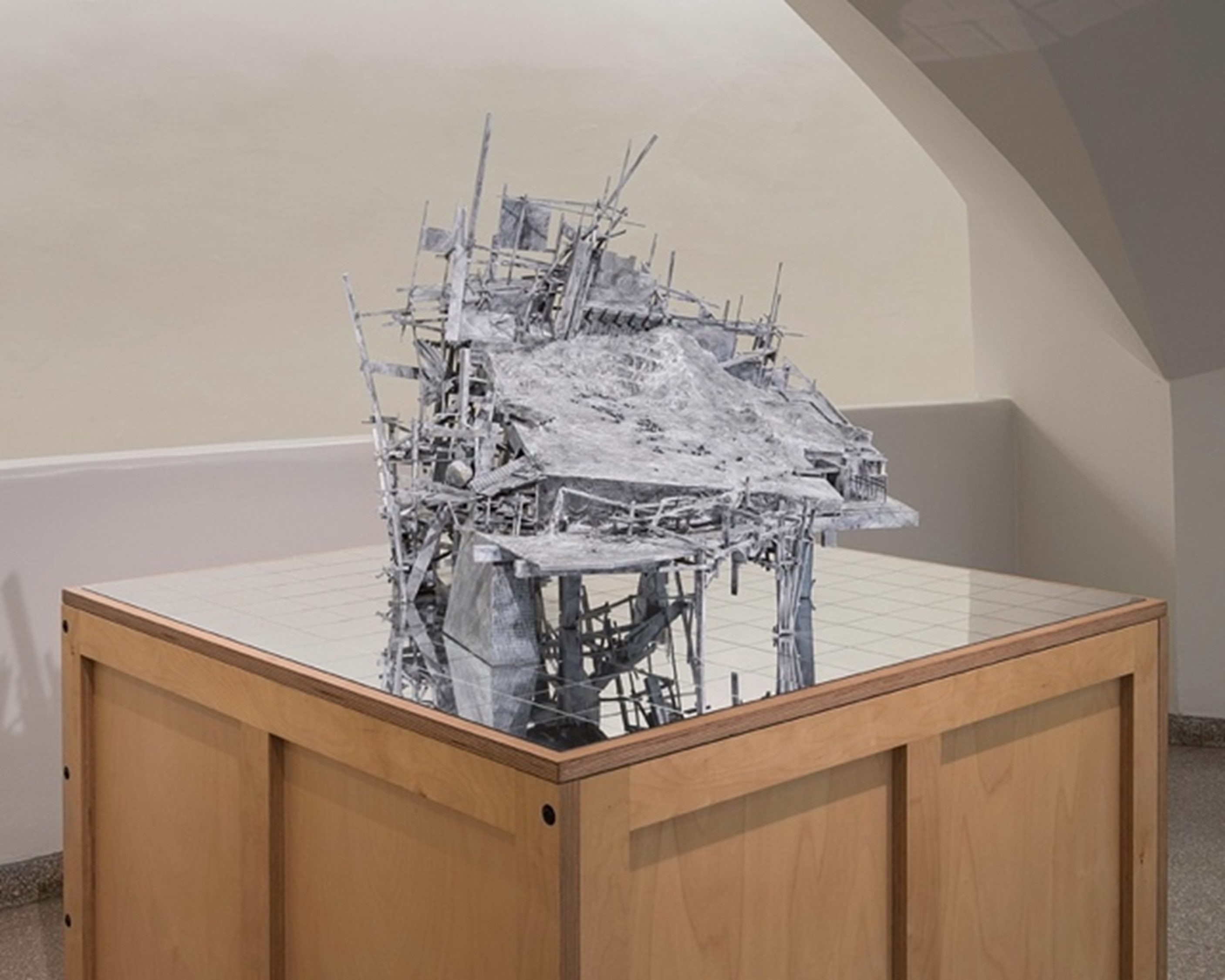 Wood, acrylic mirror, polyurethane, paper, glass beads, and acrylic paint