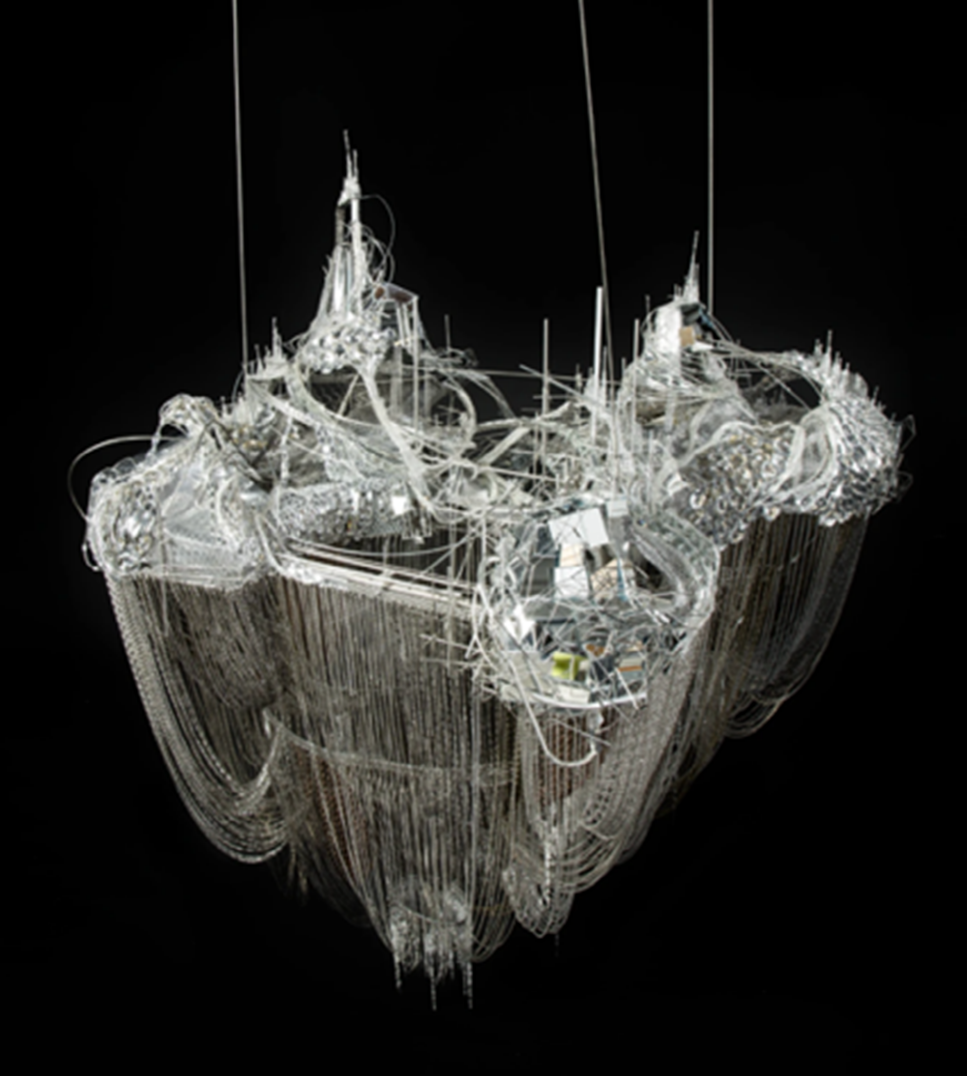 Crystal, glass and acrylic beads on stainless-steel armature, aluminum and copper mesh, PVC, steel and alumnium chains, mirrored film