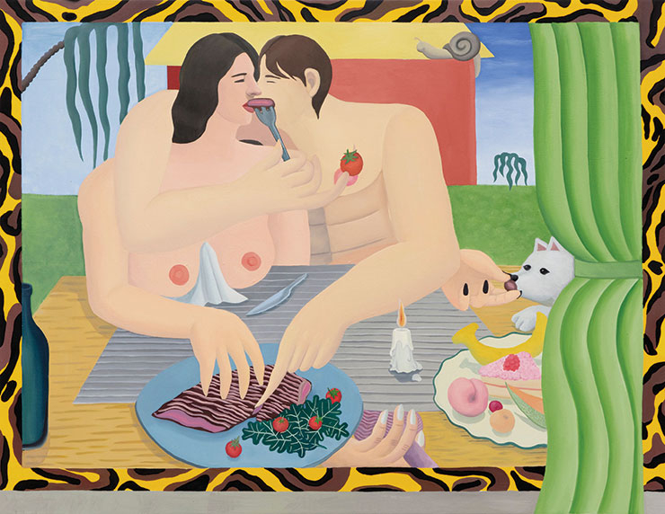 Her recent solo exhibition at Perrotin New York, 《Fun and Games》(2024), further fragmented and complicated her approach to figures and objects, pushing the formal boundaries of painting. 〈Under Cover〉(2023), structured like a still life, features a topless woman seated before a table where a dissected fish, a lemon, and a vertically impaled knife are arranged, evoking unease and a surrealist atmosphere.