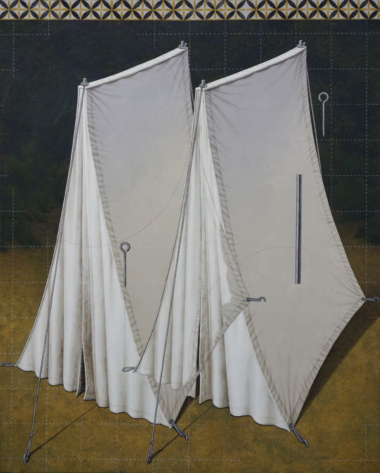 His solo exhibition 《Boundaries》 (2021) at Hakgojae Gallery marked a shift toward more fluid compositional structures. Works such as Camping(2020) and Overlapped Tents(2020) investigate the structural logic of military tents, exploring the ambiguous boundary between interior and exterior, as well as the individual and the collective. Tents act as both protective barriers and porous membranes, much like the boundaries between human bodies and social constructs. This exploration continues in the series ‘How to Set Up the Tent’(2020), where floating components and dotted guide lines evoke assembly instructions, reinforcing the idea that individuals (or individual components) are structured and dismantled within a broader system.
