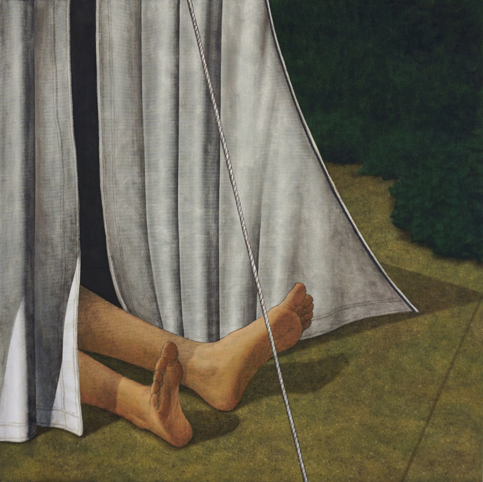 His solo exhibition 《Boundaries》 (2021) at Hakgojae Gallery marked a shift toward more fluid compositional structures. Works such as Camping(2020) and Overlapped Tents(2020) investigate the structural logic of military tents, exploring the ambiguous boundary between interior and exterior, as well as the individual and the collective. Tents act as both protective barriers and porous membranes, much like the boundaries between human bodies and social constructs. This exploration continues in the series ‘How to Set Up the Tent’(2020), where floating components and dotted guide lines evoke assembly instructions, reinforcing the idea that individuals (or individual components) are structured and dismantled within a broader system.