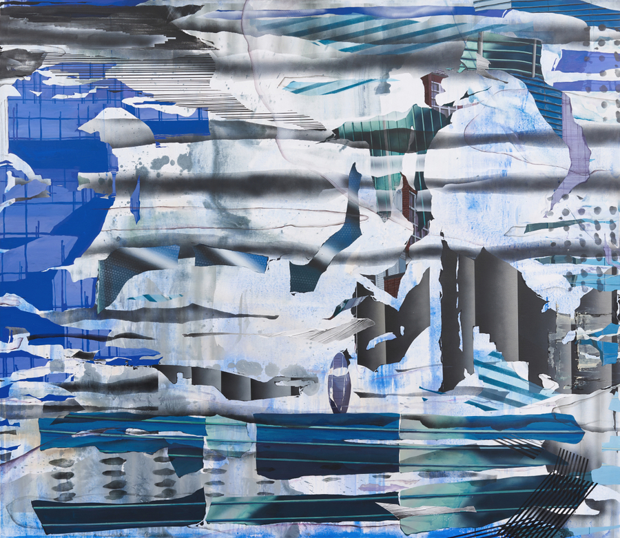 Hwang’s works reinterpret the stratified structure of the city through a painterly language built from heterogeneous materials—drawing, screentone, acrylic, tracing paper—and often unfold as layered compositions. Her collage-like process involves digital sketches, photographic transfers, and recursive incorporation of image fragments between screen and canvas, resulting in paintings where the boundaries between material and immaterial, analog and digital, are deliberately destabilized. Her ‘Moire’ (2020–) series is a representative example, using interference patterns that shift with the viewer’s movement to evoke perceptual dissonance and optical tension.