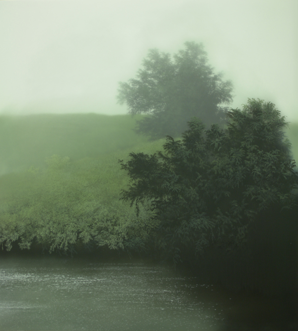 His landscapes aim not at specific geography but at a universal condition of nature. Recurring motifs — trees by water, fog-filled spaces, dissolving horizons — form a symbolic topography. This terrain functions less as a record of place than as a map of states of being. Individual works therefore read as variations within a continuous field of thought rather than isolated images.