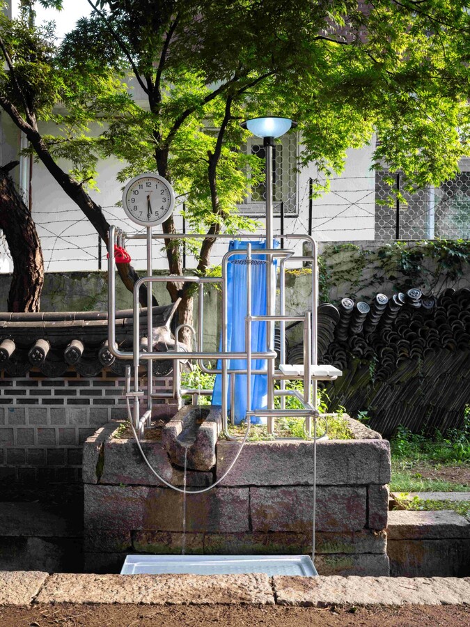Across cities like Busan, Seoul, and Lyon, Lee Yona’s installations anchor her sculptural logic to site-specific research. In En Route Home (Busan Biennale, 2020), she responded to the industrial and migratory history of Yeongdo Island by filling a warehouse with personal domestic objects—beds, toothbrushes, canned goods—inside a maze of stainless steel. In Fountain In Transit (2023), she animated a dormant courtyard fountain using bathroom fixtures and public infrastructure to create a temporary functional sculpture.