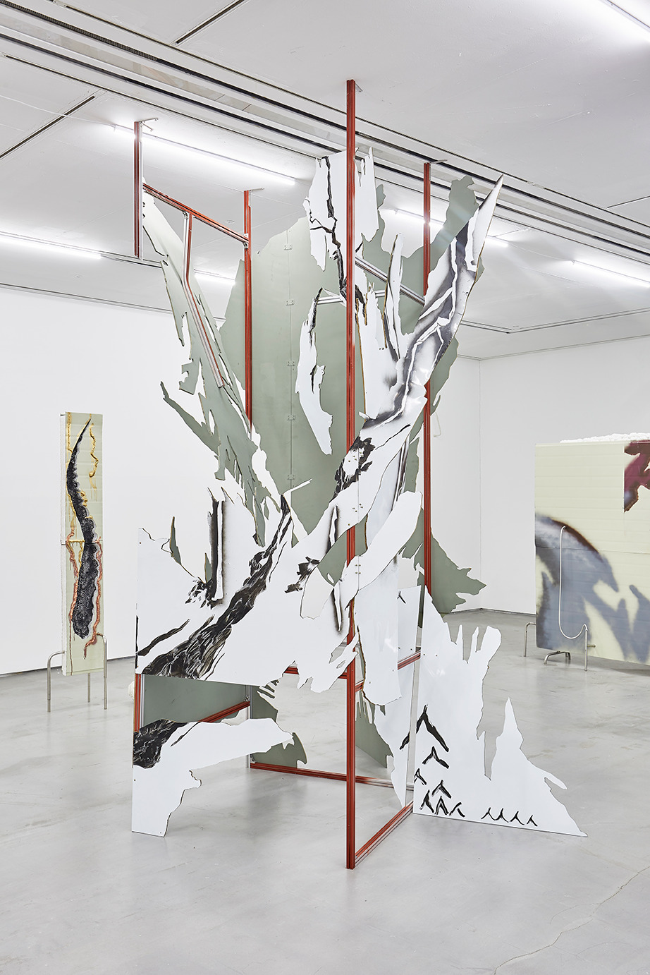 From Mercilesspillar (2019) onward, she transitioned to using more industrial materials such as aluminum, MDF, cement, and stainless steel, physically constructing remnants of disaster. Resurrection of Paul the Psychic Octopus (2019) employed EPS panels and spray paint to sculpturally expose the fictional nature of disaster prophecy consumed by mass media.