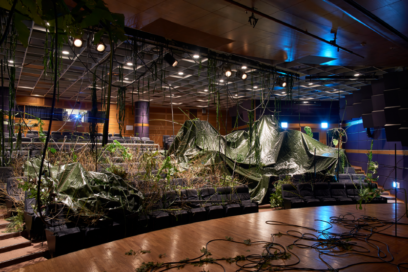 In 《Pirated Future+Doomsday Garden》 (Art Sonje Center, 2019), Jung documented visits to disaster sites like Chernobyl and Fukushima, capturing the process by which images of devastation are replicated and consumed through an artificial jungle installation and documentary video. Pirated Future presents the rift between the chain of media images and real landscapes, while the artificial plant forest of Doomsday Garden immerses the audience into an indeterminate post-apocalyptic space.