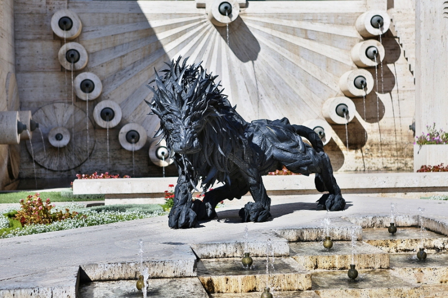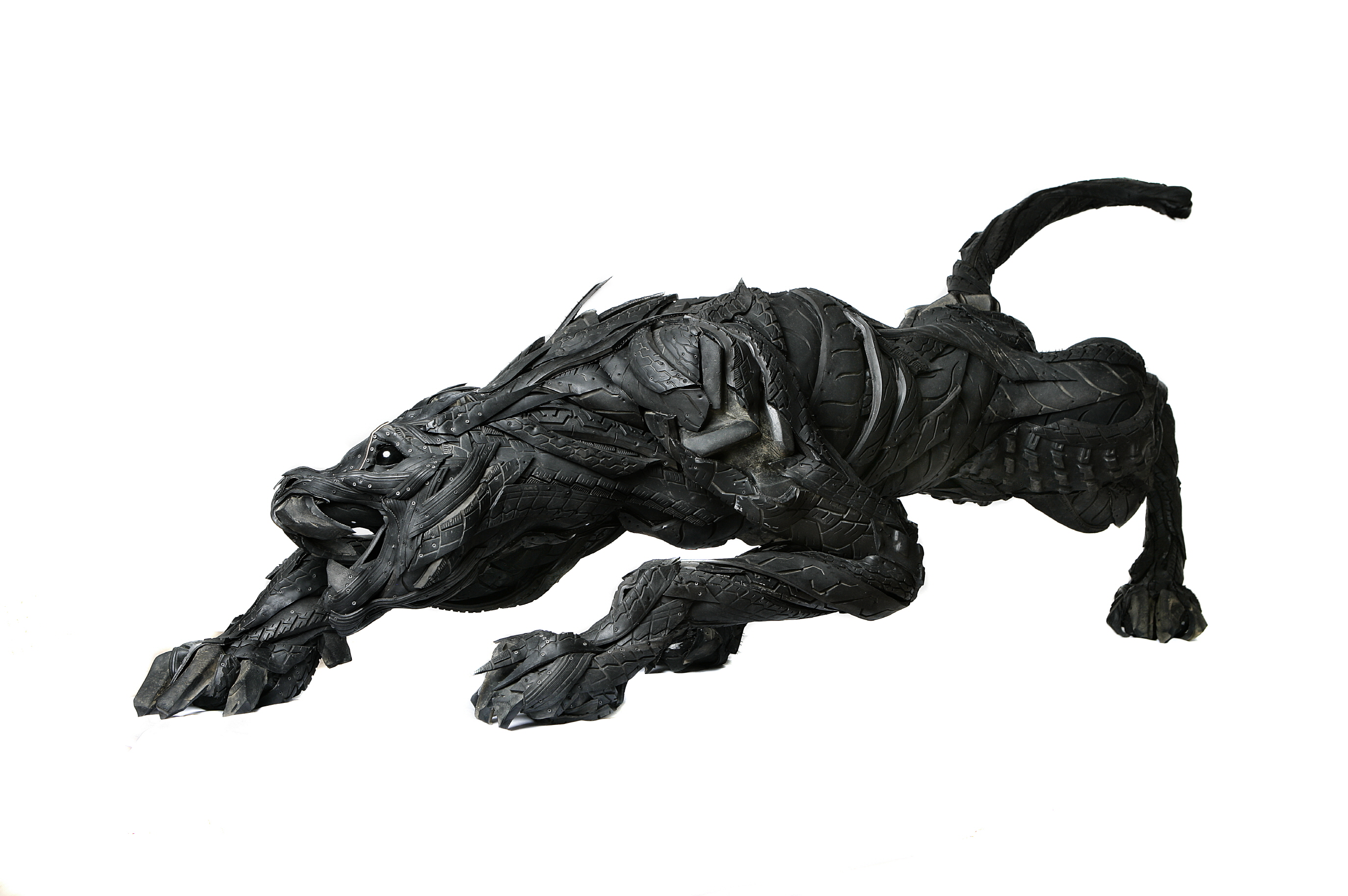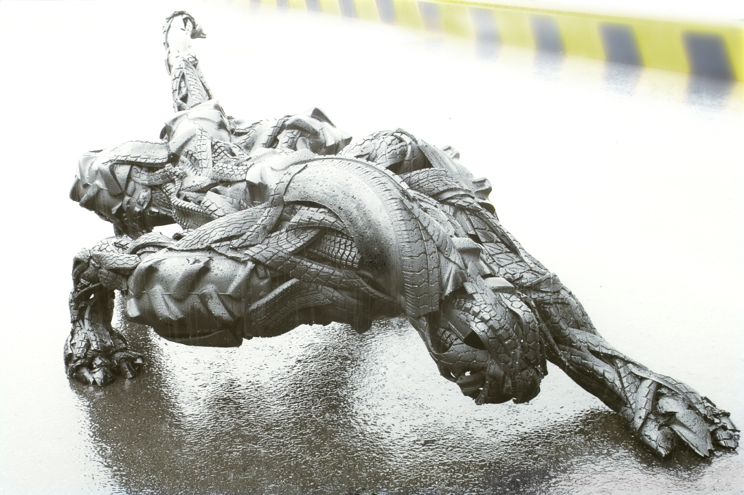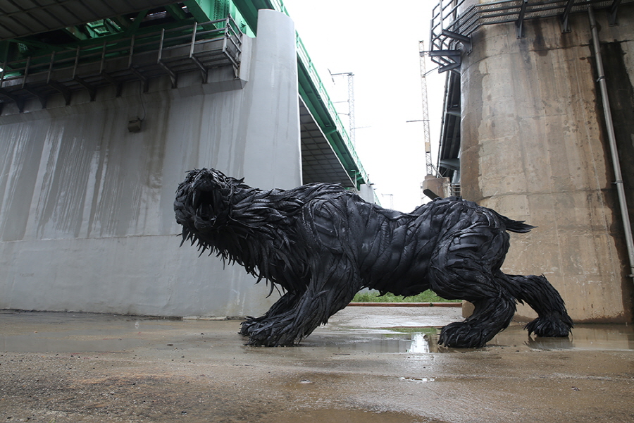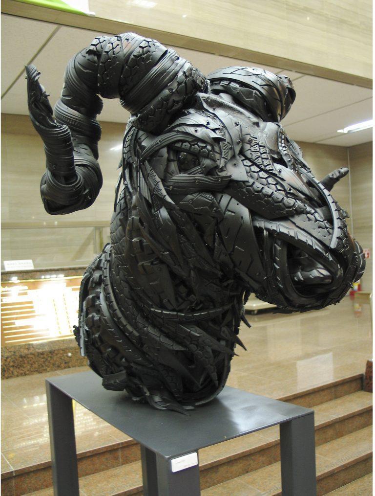 ‘Tire Mutant’ is created with worn-out rubber tires, cut and pasted on a prefabricated frame with iron or wood to finish the sculpture shape. After the process, they build up a casting model.