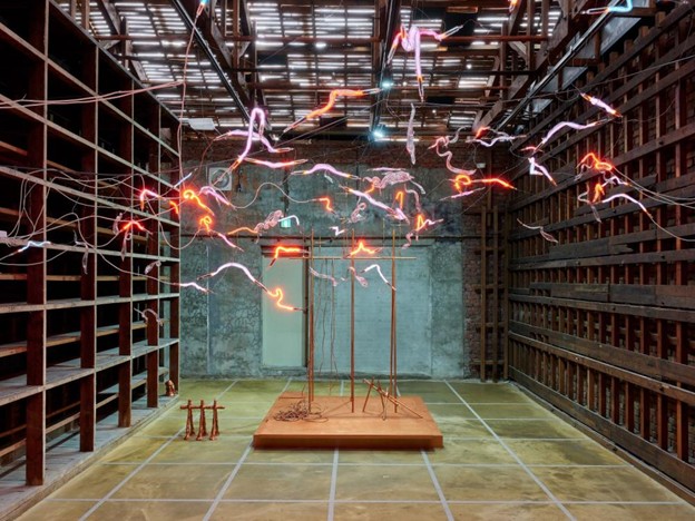 After 2020, biological elements began to play a more active role in her work as she explored organic sources of light. Phosphene Fishtank(2020) uses a viewer’s breath and oxygen saturation to gradually illuminate a jellyfish, while Breathe and Wave(2020) harnesses the bioluminescence of dinoflagellates and transforms it into a form of light activated by human interaction. In this way, Park integrates biological responsiveness, environmental conditions, and sculptural form to construct intricate ecosystems.