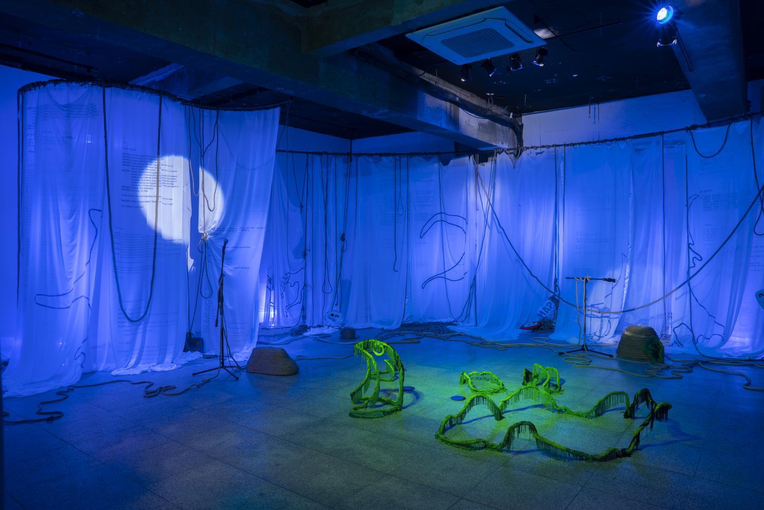 In 2022 the snake motif mobilizes temporality and tactility along the border of inside/outside the institution. Especially in 《Ecotone: Capacity for Escape》, spatiotemporal installation and the performance Interpermeations make the boundary between body and non-body reversible through the contact of image, sound, and costume.