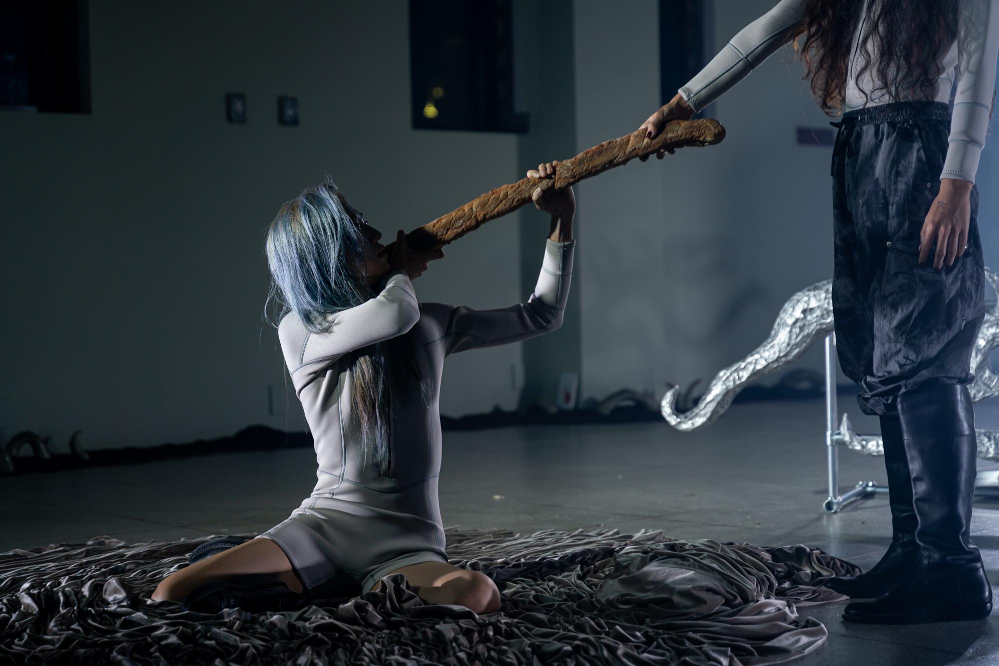 In 《Ecotone: Capacity for Escape》(Post Territory Ujeongguk, 2022), the “snake” is re-signified as an entity that traverses boundaries of race, gender, and sexuality. The performance Interpermeations(2022) renders the borders of fixed identity slippery through the ambivalence of “penetration/inter-permeation,” performatively proposing the axiom “contact = escape.” The 2023 series ‘a fist is a fist is a fist’ probes political moments when the collective body ignites, condenses, and disperses.