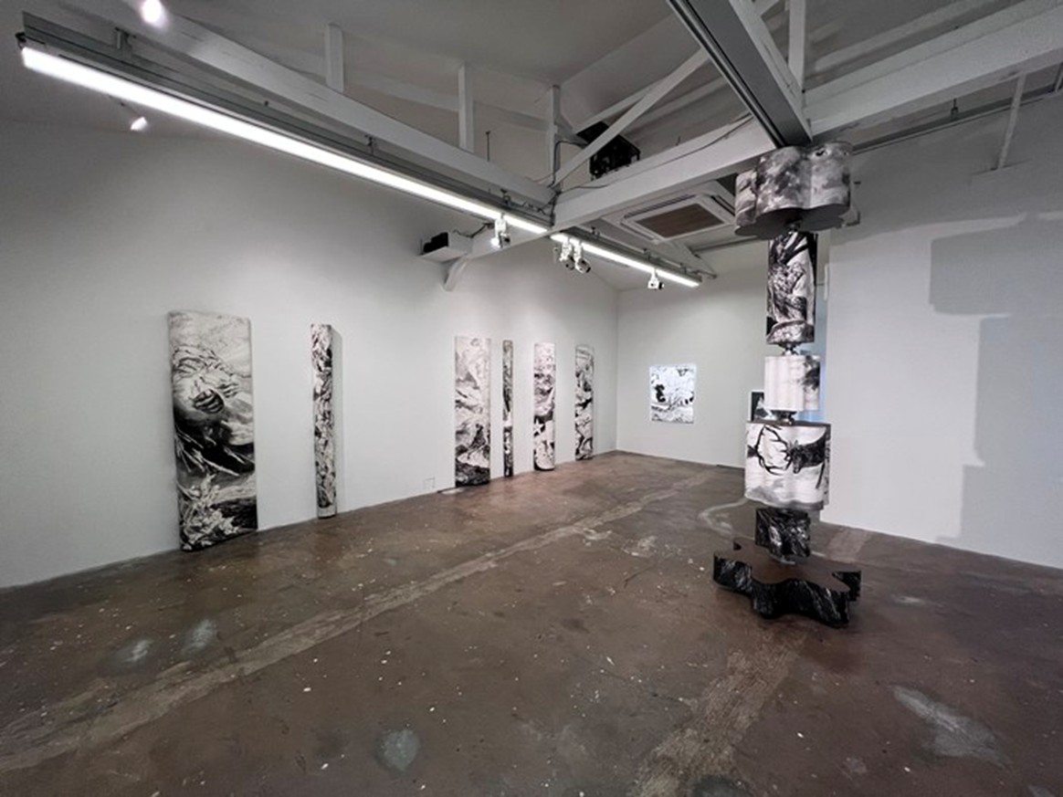 In 《In My Darkest Moments, Even My Own Shadow Abandons Me》, painting once again extends into the spatial dimension of installation. Fragmented canvases and paintings placed upon protruding structures form a continuous narrative, while the flow of linear brushwork follows the emotional trajectory of the character Q. Moving beyond representation, Joo constructs a sensory narrative that traverses the boundaries between light and darkness, structure and emptiness, surface and space.