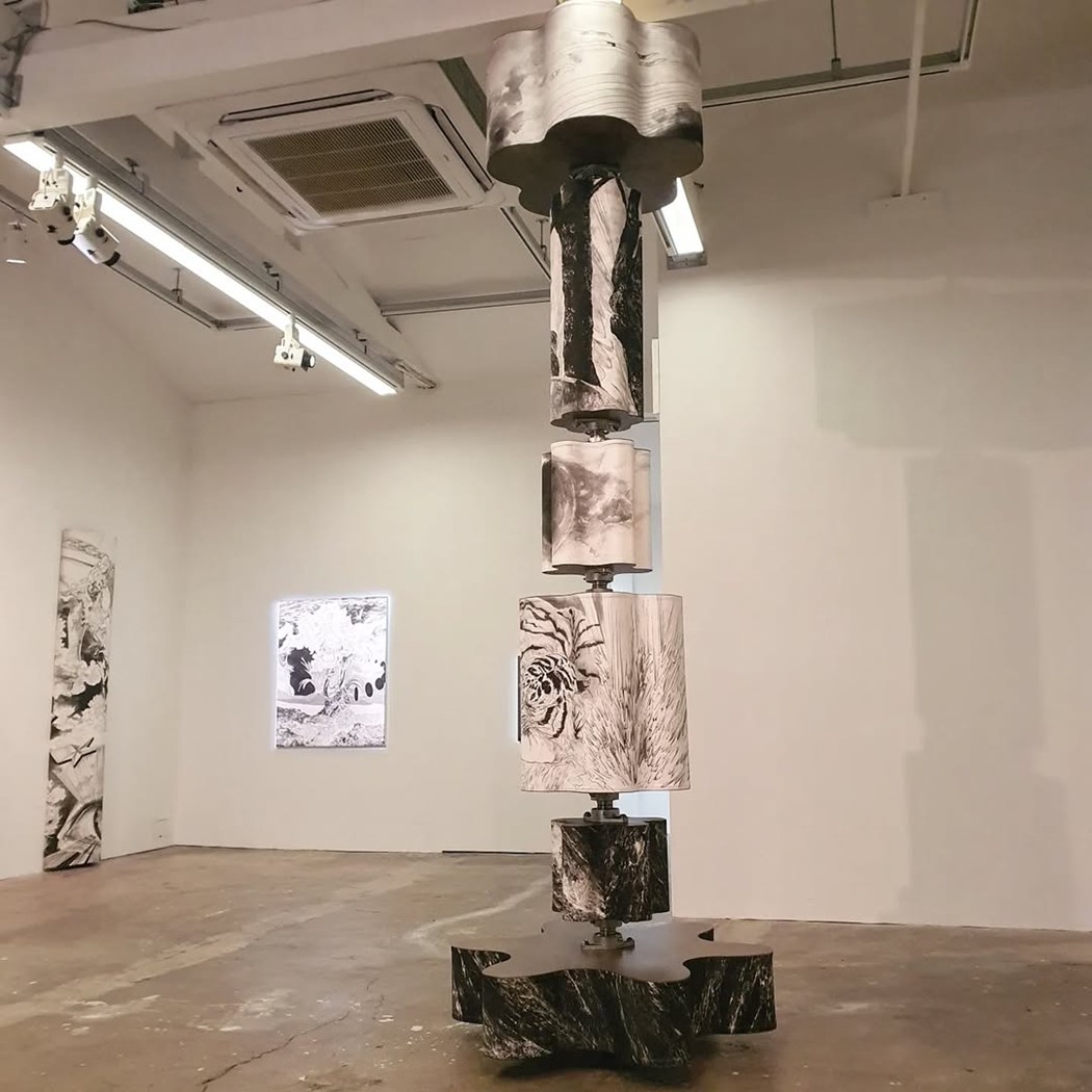 In 《Complete Association》, he cut and reassembled his previous paintings to guide an active mode of viewing through the relationship between parts and whole. This approach can be seen as a reinterpretation of the traditional East Asian notion of yeobaek (emptiness) as a psychological and perceptual framework. Utilizing both the jungchae (重彩) method of layering pigments and the junbeop (皴法) brush technique, he expressed internal anxiety through the tonal and textural qualities of ink. The interplay of black and white and the intentional voids within the surface function as visual devices that reveal the “in-between” spaces of the image.