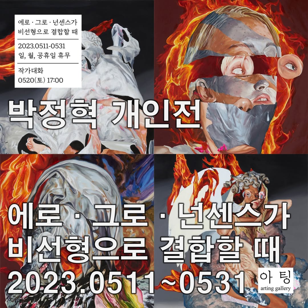 Park Jung Hyuk’s solo exhibitions include 《Rebellious possibility》(Yeol Jeong Gallery, Seoul, 2025), 《When Ero·Gro·Nonsense Combines Nonlinearly – Episode 1》(Museum1, Busan, 2024), 《When Ero·Gro·Nonsense Combines Nonlinearly》(Arting Gallery, Seoul, 2023), 《Myth, Representation of the Era》(Artertain, Seoul, 2022), 《Drowsy Floating》(Artertain, Seoul, 2019), 《Flowing Memory》(Alternative Space Epo, Seoul, 2019), 《Temperature of Sensation – Park’s Memory》(Dorothy Salon, Seoul, 2018), 《Ordinary People》(Gallery Absinthe, Seoul, 2011), 《Resupination》(Insa Art Space, Korea Culture & Arts Foundation, Seoul, 2004), and 《Malocclusion》(Artspace Hue, Seoul, 2003), among others.