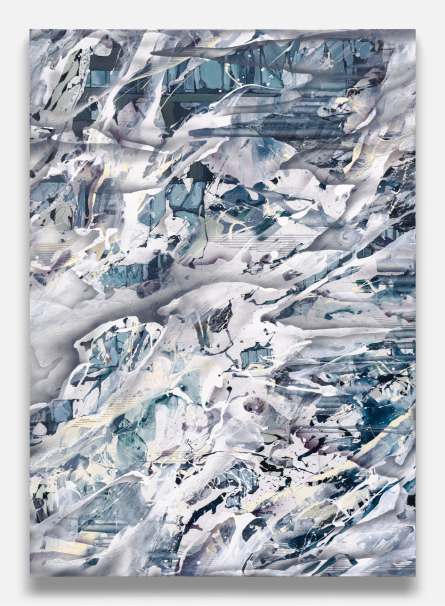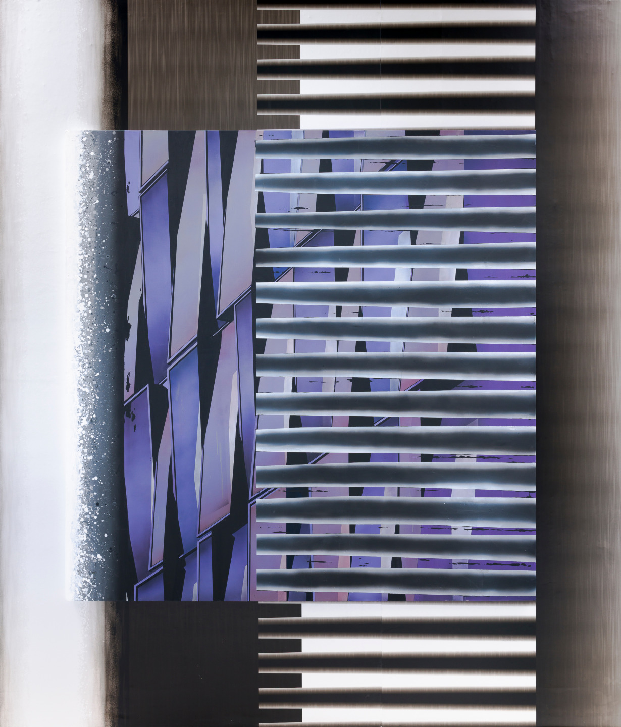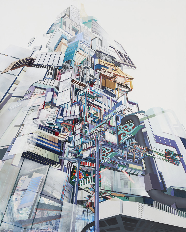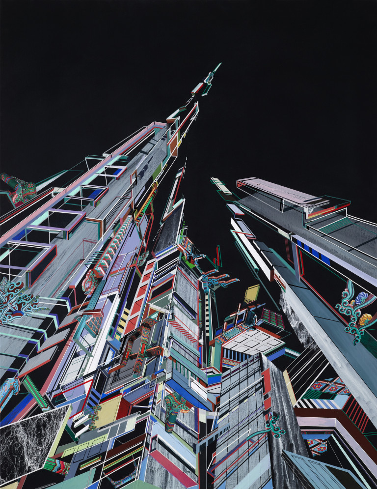 Hwang’s works reinterpret the stratified structure of the city through a painterly language built from heterogeneous materials—drawing, screentone, acrylic, tracing paper—and often unfold as layered compositions. Her collage-like process involves digital sketches, photographic transfers, and recursive incorporation of image fragments between screen and canvas, resulting in paintings where the boundaries between material and immaterial, analog and digital, are deliberately destabilized. Her ‘Moire’ (2020–) series is a representative example, using interference patterns that shift with the viewer’s movement to evoke perceptual dissonance and optical tension.