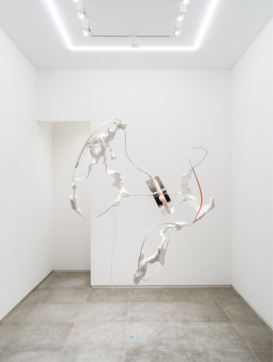 그런가 하면 P2에 산발적으로 설치되어 있는 조각과 드로잉은 추상과 구상의 경계를 넘나들며 육안으로는 확인할 수 없었던 신체 구조물이 파편화된 형태처럼 보인다. 자유로워진 몸체들은 다채롭고 선명한 색상으로 덧입혀져 천장과 벽면 곳곳에 위치해있다. 특히 가느다란 니켈 와이어에서 뻗어나오는 덩어리 형상의 작품 〈polar〉는 위태로워 보이지만, 서로를 지탱하는 원동력인 긴장감에 주목하게 한다. 금방이라도 흔들려 떨어지거나 다른 무언가와 접착할 것 같은 상상을 불러일으키는 P2 공간의 점유물들은 신체 감각에 대해 작가가 자유롭게 던져놓은 실험의 파편들인 것이다.