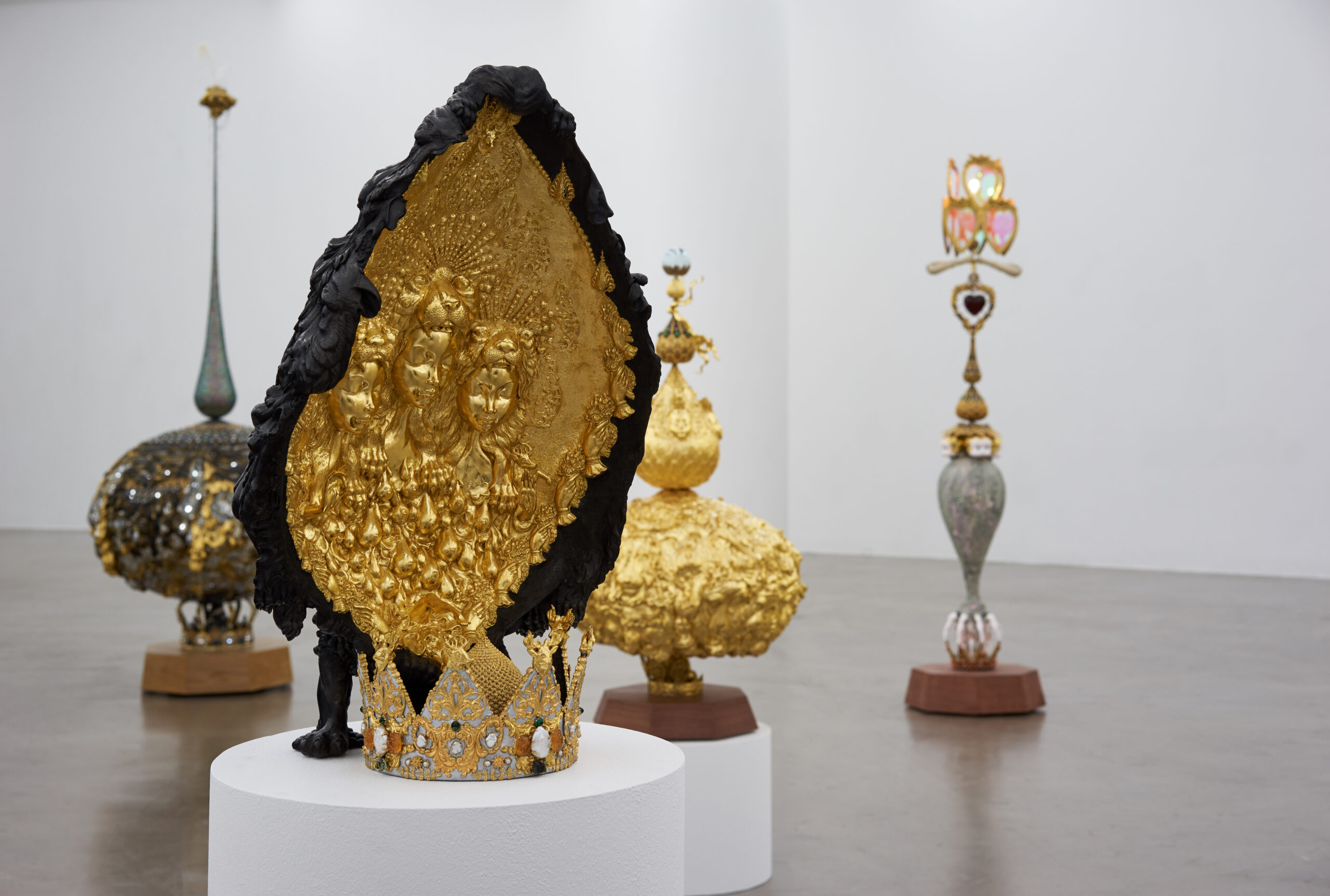 신라의 금관과 백제의 금동대향로의 형태에서 영감을 받은 작가는 권력의 상징인 왕관을 머리 위가 아닌 받침대로 두고, 이로부터 사물이자 신체인 작업을 뽑아 올린다. 가까이 다가서면 각각의 작업을 이루는 세부가 시선을 끄는데, 철, 놋쇠, 유리, 진주, 자개, 원석, 거울 파편 등 다양한 수공적 재료들이 얽혀서 작품의 표면을 촘촘히 덮고 있으며, 천사, 기도하는 손, 십자가, 용, 식물, 만화 주인공과 요술봉 등 다양한 상징의 무늬와 형상들이 드러난다. 이 같은 재료들이 모여 생겨난 형태는 파편들의 모자이크로부터 출발해 점차 불꽃에 융해된 듯 녹아내리는 형상으로 나아간다.