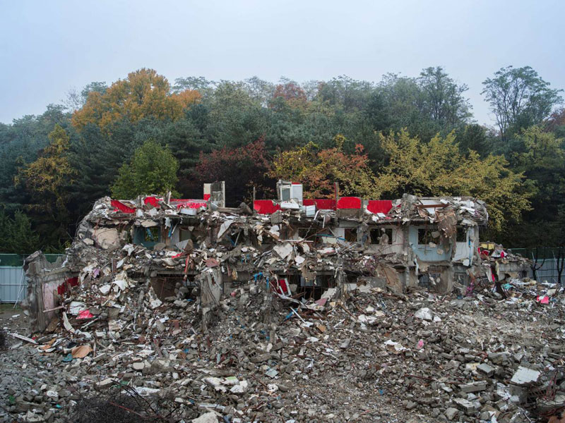 반면, 이 시리즈의 직후에 시작되었지만, 재건축이라는 과정에서는 오히려 그 전 단계에 속하는 ‘철거 현장Demolition Site’(2013)에서는 전혀 다른 감성이 화면을 지배한다. 이 작업은 작가가 철거 중인 건물에 직접 들어가 임의로 선택한 내부 공간을 붉은색 페인트로 칠한 후, 다시 밖으로 나와 철거 진행과정을 지켜보다가 붉은색의 내부가 일시적으로 드러나는 순간들을 촬영하는 과정으로 이루어진다. 재건축이라는 주제, 건물의 내부 구조에 대한 관심, 그리고 그 구조를 드러내기 위한 작가의 개입까지 개념적으로는 ‘공사 현장’과 크게 다를 바가 없음에도 불구하고 이 연작은 훨씬 더 극적이고 강렬한 감성을 불러일으킨다. 물론 생성보다는 소멸의 이야기가 언제나 더 자극적인 법이며 피와 살을 연상시키는 붉은색의 상징성도 여기에 가세한다. 그러나 한편으로는 작가의 개입이 훨씬 더 적극적인 이유에서 실행되었다는 점도 중요하게 작용한다.