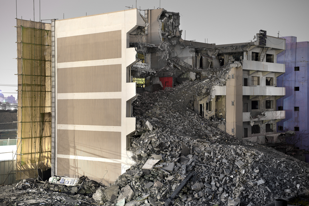 정지현은 주로 부서지는 건물을 찍는 사진가다. 다시 말해, 건물이 부서지는 순간을 목격하는 것이 정지현의 일이다. 목격한 장면을 사진에 담으면, 그 뒤에는 어떻게 보여줄 것인지 고민해야 한다. 목격한 장면을 어떻게 찍을 것인지도 물론 고민해야 한다. 그러한 충동, 즉 찍어서 남기고자 하는 사진가적 충동 안에는 여러가지 복잡한 작가의 사정이 있다. 그러나 작가의 개인적 사정에 대해 이야기하기 전에 우선 알아보아야 할 것이 있다. 작가가 카메라를 갖다 놓는, 셔터를 누르려는 충동이 발생하는 대상, 건물이 부서지고 있는 한국적인 상황 말이다.