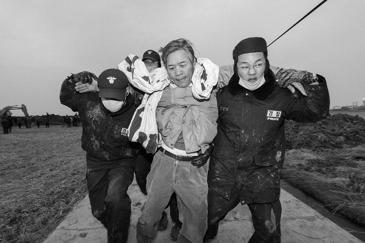 앞둔 평택 대추리에서, 백발이 성성한 늙은 신부가 악을 쓰며 전경과 맞서는 제주 강정마을에서 노순택은