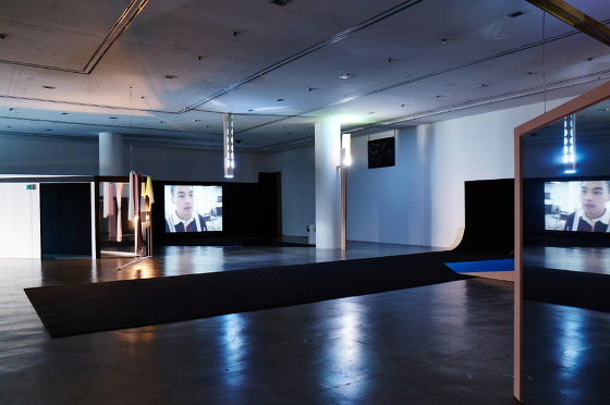 두 개의 영상은 검은 카펫 (또는 경계)에서 보게 되어 있는데, 검은 카펫은 단지 바닥이 아닌 평면의 공간으로, 전시의 맥락으로
