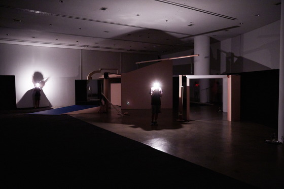 안에 원래 있던 조명은 하나도 사용하지 않고, 설치 안에서만 쓴 조명으로만 전시를 구성했다)이나 서 있으면서 빛을 내는 어떤 시선-신체로서의 구조물, 허공에 떠 있는 나무 막대기 등이 온전한 평면성을 거역하며 시선을 분산되게끔 만든다.