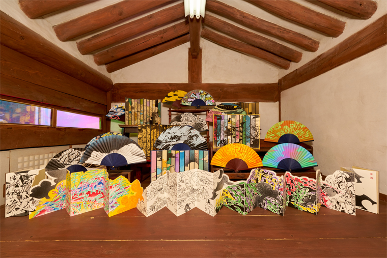 10여 년이 지난 뒤 작가는 그림으로 채워진 부채와 화첩을 다락에 설치해 파노라마(panorama) 같은 무대를 만들었다. '산' 시리즈(2025)와 '구름' 시리즈(2024~2025)는 선면화(扇面畵)이자 오브제-부채이고, 산수로 채워졌으나 병풍처럼 공간에 직립한 화첩이다. 회화이자 설치이다. 작품의 받침대가 되어준 이상범가옥의 협탁과 소품들은 자연스러운 산세를 형성하기에 적합했다. “부채 하나하나가 산이고 언덕이고 구름이었다.” 용이 사는 곳은 어디일지 다시금 상상해 본다. 구름은 바람에 이리저리 뒤집히고 흐른다. 구름 속의 산은 홀로 오뚝하지 않아 좋다. 작지만 넓고, 평평해서 깊음을 전하는 시공간이다.
