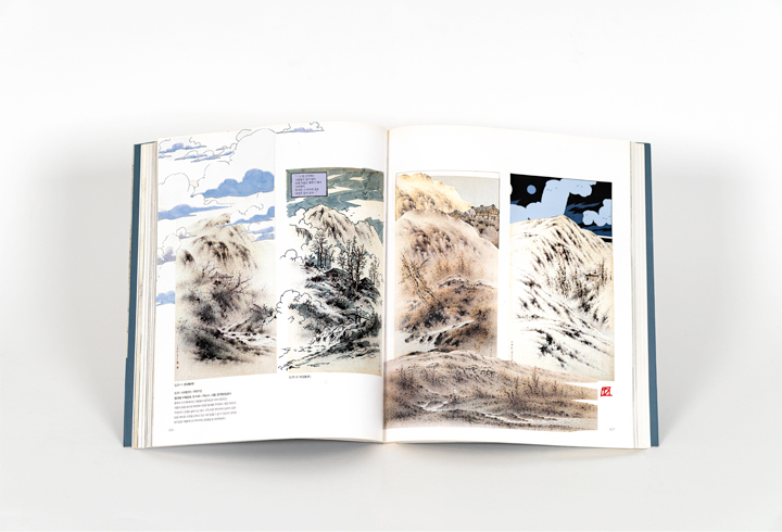 특히 〈사계산수〉와 〈한림모설〉에서는 “작품 속 이미지를 뒤섞기보다” 계획적이지만 변칙적인 “지층을 그리듯 차곡차곡 쌓았다.” 그로 인해 완만한 형상과 수평적 구성에서 시작했으나 가파른 산세의 풍경으로 귀결될 수 있었다. 또한 특정한 작품 한두 점을 지목할 수 없을 정도로 많은 작품 이미지와 이미지를 넘나들며 유영한 뒤의 흥취와 영감을 담았다. 어쩌면 도록 한 권이 작가가 노니는 하나의 풍경이었을지도 모르겠다. 작가는 “힌트를 주듯 나룻배나 초가집처럼 이상범을 대표하는 도상들을 풍경 사이사이 숨기며 즐거워하기도 했다.”