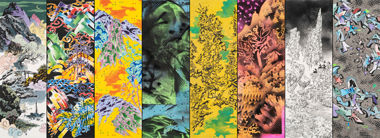 손동현, 〈사계산수〉, 2024-2025, 종이에 먹, 잉크, 아크릴릭 잉크, 크레용, 인주, 182 x 360 cm x (8) © 손동현
