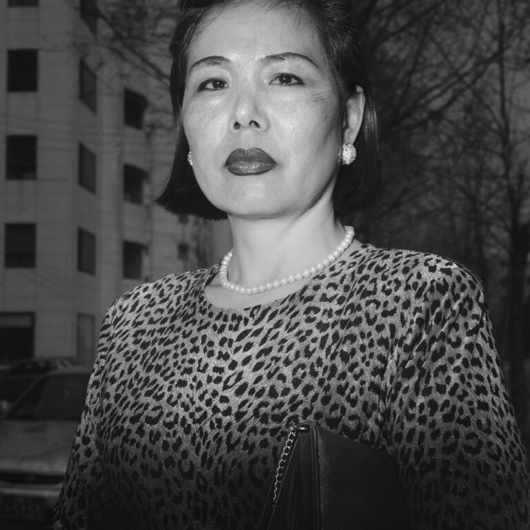 흐르는 진땀, 그리고 옷감이 자아내는 묘한 질감은 플래시를 통해 더욱 번득이며 발광한다. 검은 배경과 흑백사진은 이 아줌마의 현실적 삶의 공간을 늪처럼 뒤로 물리고, 가라앉히고 오로지 화장으로 인해 번들거리는 얼굴과 광채, 이상한
