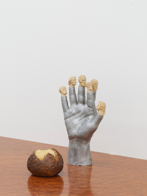 모양의 식탁 위에 실제 크기의 알루미늄 주조 손이 세워져 있다. 각각의 손에는 여섯 개의 손가락이 달려