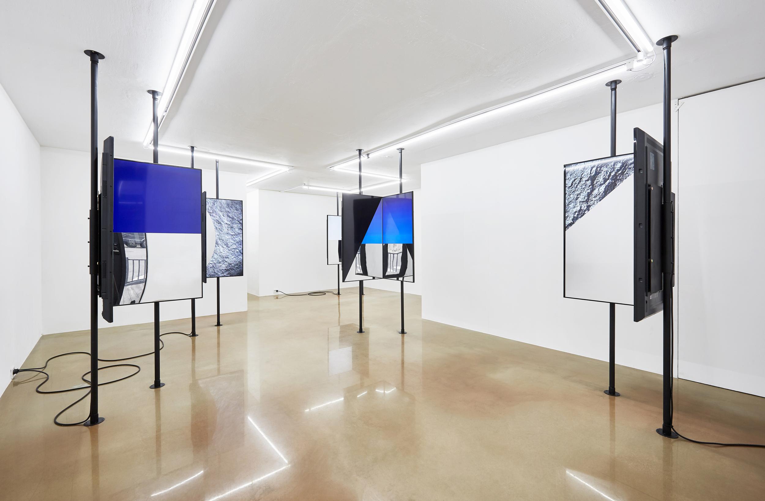 기하학적 형태의 오브제, 그 세부 각각은 파악하기 어려운 요소들이 아니다. 하지만 직각을 마주한 모니터들과 그 위에 부착된 거울은 옆 모니터의 영상과 주위 환경과 사물을 담아내고 뒤섞인다. 정면을 반영하는 거울은 외부를 내부로 끌어들이고, 모니터는 내부의