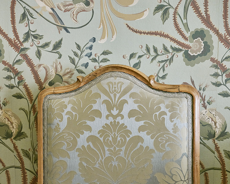 민트색 벽지 바탕에 초록색과 갈색 계열이 어우러진 색채 위로 꽃과 줄기와 이파리 등 식물의 곡선이 화려한 움직임을 드러낸다. 관건은 그 앞에서 정면을 응시하고 있는 의자인데, 의자의 생김새와 등받이 표면에
