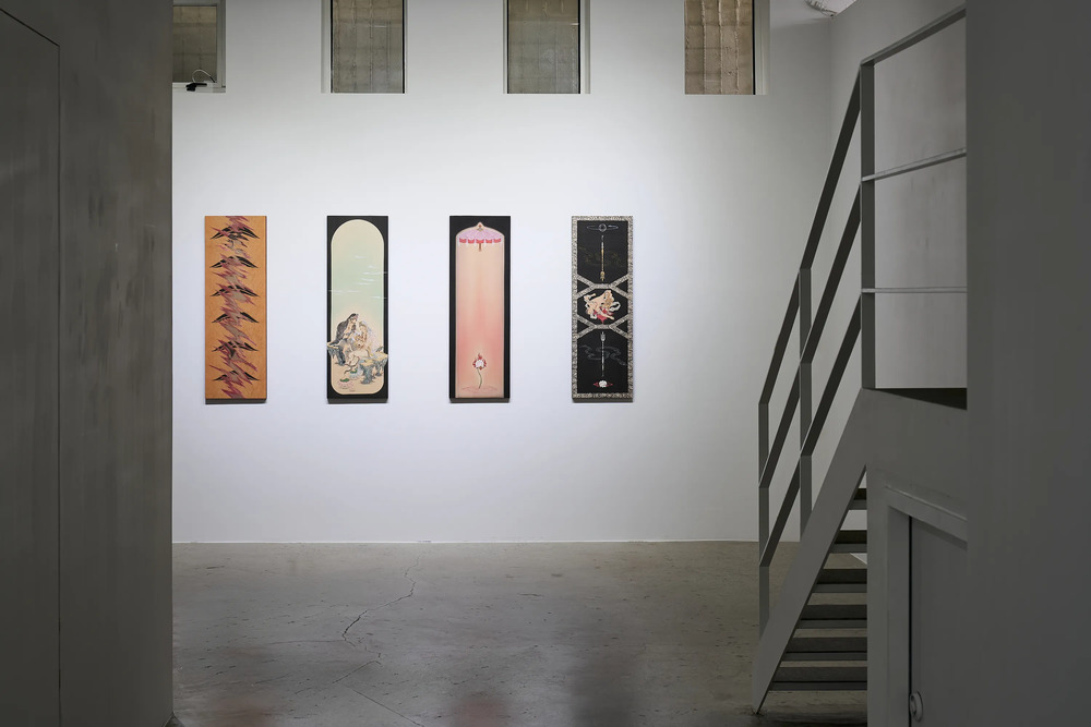 이중 구조의 한 축에는 작가의 퀴어 정체성이 자리한다. 작가는 이번 전시에서도 여러 퀴어 코드를 발견할 수 있다고 설명하는데, 실제 전시에서는 직립한 남근의 형태, 분출하는 사정의 장면, 구멍 등을 연상케 하는 이미지를 어렵지 않게 찾아볼 수 있다. 일례로 물과 불처럼 서로 다른 성질의 것들을 뿜어내는 〈일극 日劇〉(2024)과 〈월극 月劇〉(2024)에서 호랑이 꼬리는 남성의 성기 모습으로 사정의 장면을 노골적으로 이미지화하고 있으며, 같은 작업 속 열린 커튼은 일반적인 면직물보다는 살, 혹은 신체 일부가 아닐까하는 추측을 가능하게 만든다. 이밖에 꽃, 혹은 성기 모양의 주머니들이 주렁주렁 매달려 있는 붉은 구멍과, 그 안 혹은 밖에서 짠하고 모습을 드러낸 〈호류 虎流〉(2024)의 호랑이, 탱화에서 고귀한 대상들에만 씌워진다는 우산 아래 탱탱한 호접란처럼 성기를 그려놓은 듯한 〈춘개 春蓋〉(2024)도 같은 맥락에서 읽어볼 수 있을 것이다.