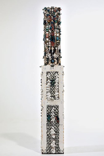 곽인탄, 〈흰 머리〉, 2020, 석고, 레진, 타공망, 철, 스텐, 142×25×23cm © 곽인탄