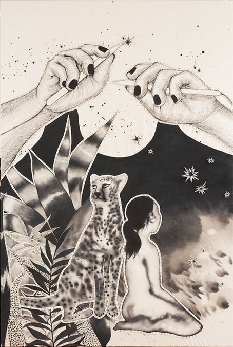 아니라 3차원 혹은 그 너머의 공간을 점유하는 부피를 갖는 것들로 인식하고 있었던 것일지도 모르겠다. 전시장의 가로축과 세로축을 따라 확장되는 검고 옅은 장면들은 광활한 하늘과 어둠 속의 달무리, 천상에 뿌려진 별들과 무수한 작은 실존들의 삶을 포용하는 울타리가 된다.