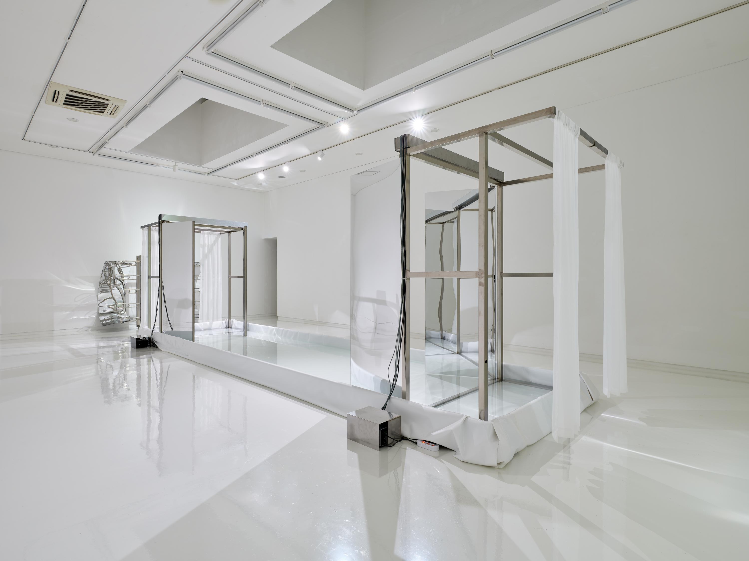 역시, 공간 중앙부에 길게 자리했던 물의 파동과 빛의 반사가 거울처럼 기능하면서 공간 전체를 감싸는