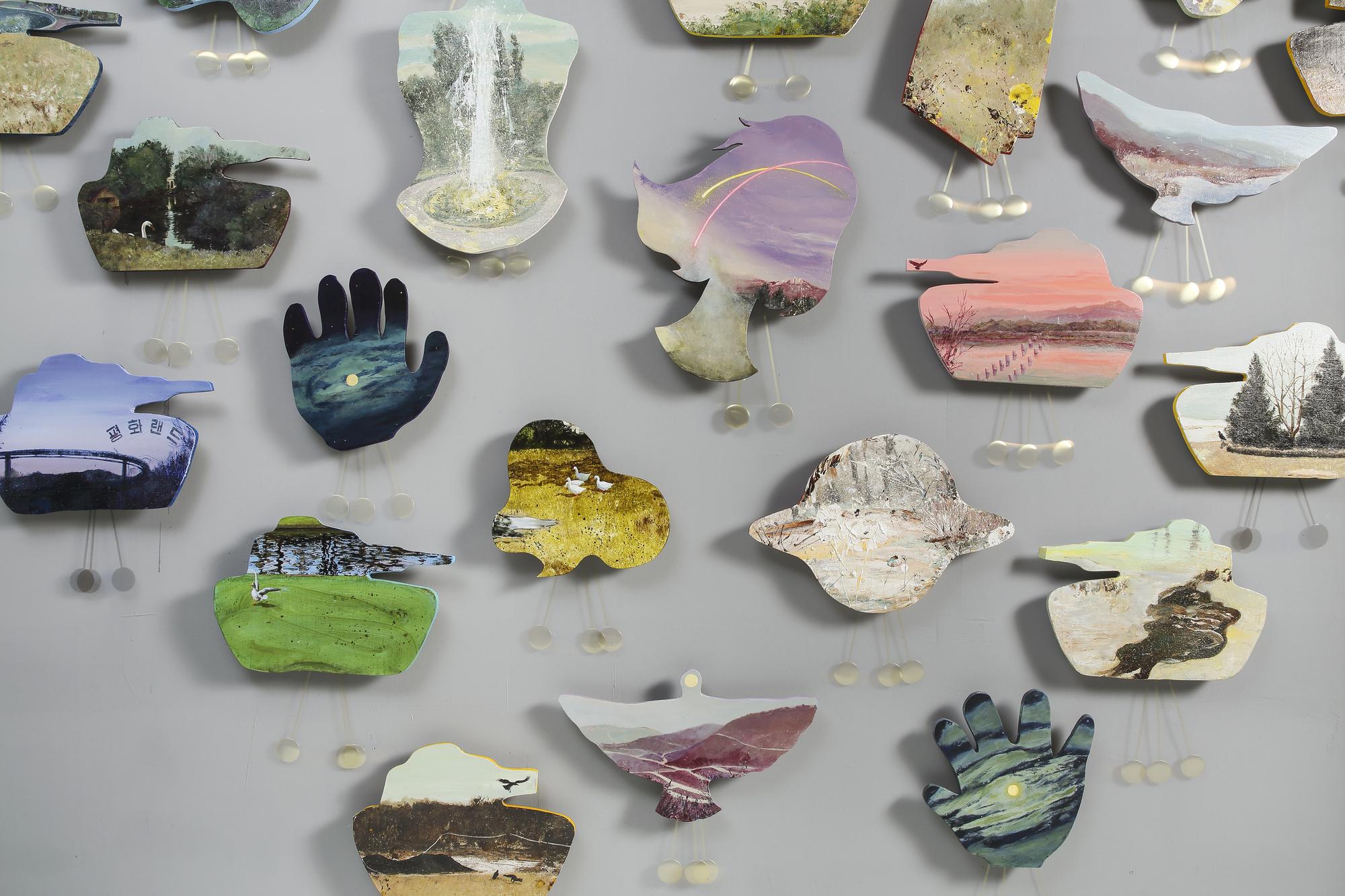 〈길 위에서〉의 아홉 점의 그림으로 돌아오면, 좌측부터 두 개의 강원도의 산, 스치는 풍경, 숲의 세 존재들, 발사되는