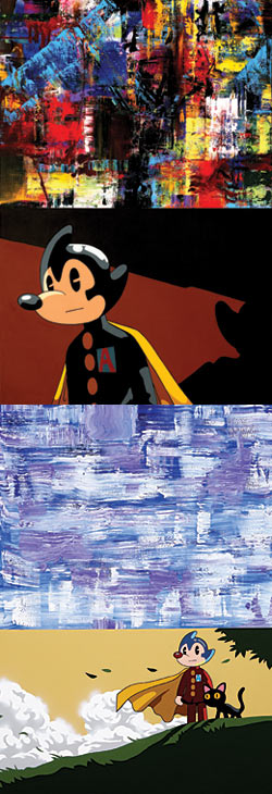 알록달록한 꽃이 만발한 언덕에 ‘아토마우스’가 서 있다. 만화 주인공 같은 캐릭터지만 푸른 하늘을 배경으로 의젓하게 서 있는 자세가 제법 진지해 보인다. 입고 있는 교복을 보면 아토마우스는 〈친구〉의 장동건과 같은 세대일 듯하다. 펄럭이는 망토는 친구들 사이의 우정과 배신이라는 제법 진지한 문제에 빠져 있던 영화 주인공들의 이면을 보여준다. 〈슈퍼맨〉, 〈배트맨〉, 〈황금박쥐〉 같은 고전적인 만화 영웅들도 이렇게 망토를 휘날리며 등장했었다.