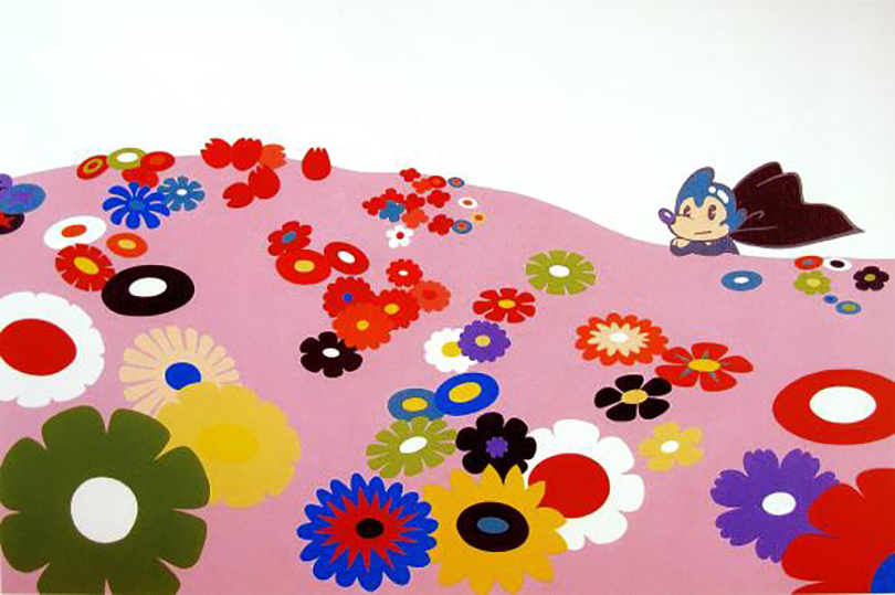 2000년에 그려진 〈꽃밭〉의 아토마우스. 여러 색의 다양한 버전으로 그려질 정도로 사랑 받은 작품이다. 아토마우스는 능청스럽게도 15세기 조선 강희안의 〈고사관수도〉에 등장하는 노인의 고요한 명상의 자세를 흉내 내고 있다! 한국 현대 미술에서 손에 꼽을 만한 아름다운 순간이다. 그 눈빛은 맑고 진지하며, 전체 정조는 평온하고 투명하다. 〈고사관수도〉의 나이든 선비는 청정한 자연 속에 그대로 머물렀으리라. 그러나 알록달록 꽃밭에서 세상을 응시하던 아토마우스는 동산에서 걸어 나와 부지런히 움직이며 역할 놀이를 시작했다. 그는 록스타로, 반가사유상으로, 기타리스트로 부단히 변신했고, 유쾌한 동작으로 그림 속으로 뛰어들었다.