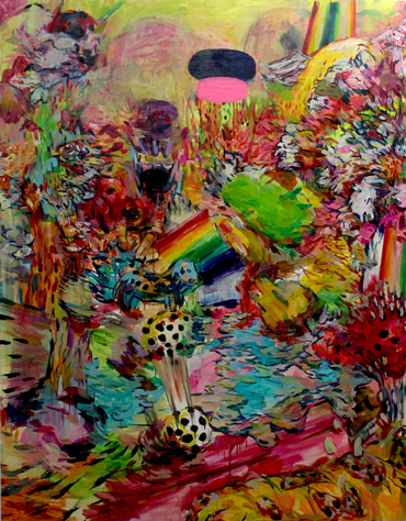 기인한 이국적인 성향의 상징물들의 위로 다른 색의 물감이 뒤덮여 삭제 혹은 지워지며 에로스를 통한 ‘관계