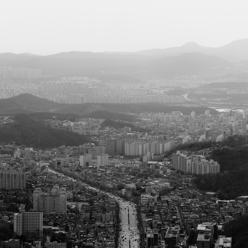 지형이 결합된 도시 풍경을 망원렌즈로 한 화면에 압축해 담아낸다. 망원렌즈의 기계적 특성에 의해 사진적 화면은