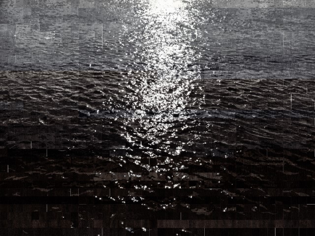 ‘물의표면’은 바람에 시시각각 파고를 달리하며 일렁이고, 이 움직임에 따라 빛이 닿아 반짝이는 부분과 어둡게 그림자가 지는 부분이 무수히 교차한다. 작가는 이러한 물의 움직임을 사진으로 담고 디지털 이미지 프로그램을 활용하여 작업 과정에 맞게 가공한다. 가공의 중심에 있는 것은 조각그림이다. 조각그림은 먹의 농담(濃淡)으로 채워져 있다. 먹의 짙은 부분(濃)과 옅은 부분(淡)의 대비로 풍경이 만들어지는데, 여기서 풍경은 고정되어 있기보단 ‘상태’에 가깝다. 짙은 부분을 물결과 그림자, 옅은 부분을 반사되는 빛이라 단정 지어 말하기 어려우며, 매 순간 물결에 떨어지는 빛이 달라지는 것처럼 각 요소는 짙은 부분과 옅은 부분의 관계로 물결과 그림자, 빛이 되어 나타난다.