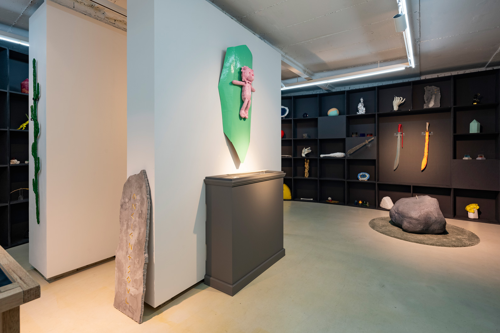 게임에서든 작가가 방문한 현실의 광물 상점에서든 불시착했다는 느낌을 제외하고 나면 아이템을 향한 총체적 감각은 부서진다. 아이템은 떼어낸 살점처럼 미완의 사물이다. 피를 막 걷어낸 것 같은 도려낸 부분에서 남는 것은 다른 이야기에서 재활용될 가능성이다. 무생물인 사물은 인간 주체와 현실의 사연/사건을 잇는 증거물이다. 차슬아가 만든 〈고기보석〉의 둥근 조색 우레탄, 석분점토로 만든 〈뼈다귀〉, 스펀지로 만든 〈치즈〉 등에는 비장하거나 부감의 전지적 시점의 스토리텔링에는 기능을 하지 않는다. 전체 서사에 조력하지 않는 차슬아의 아이템은 그래서 독립적인 조각이다.