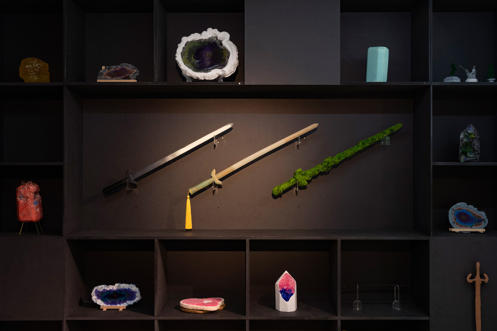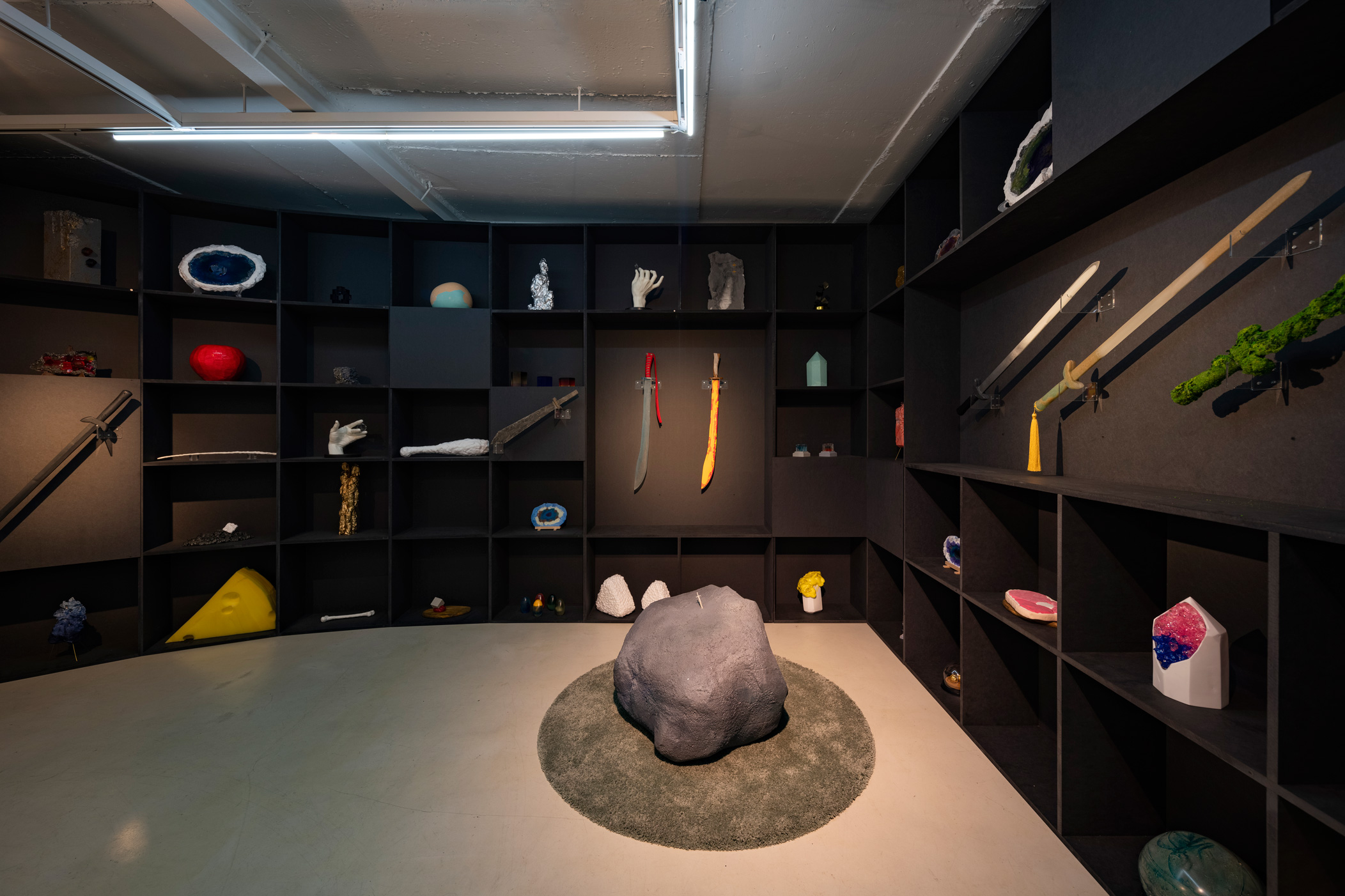 광물, 무기, 음식, 기운을 비호하는 물체 등으로 구분할 수 있다. 광물이기는 하나 〈먼지석〉 같이 시적(언어) 게임을 하다 탄생한 돌연변이들도 있다. 회색 먼지들이 엉켜 붙어 덩어리가 된 형상을 하는 이 작은 조각은 차슬아의 선택과 발주 중 잠시 개입한 ‘발견 게임/놀이’를 보는 듯 하다. 수직수평으로 진열된 그의 인벤토리는 대량 정보의 등가적 위치들을 연상시킨다. 이를 보고 있자면 사실 앞서 언급한 구분이라든가 세부 차이들보다 형태, 재료, 명명 등에서 유사성이 먼저 느껴진다.