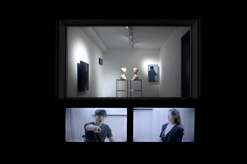 영상 작업인 〈수동적 소통〉과 스마트폰, 레디메이드 얼굴 모형 등이 배치된 〈목소리의 형태〉는 유리창을 사이에 두고 함께 보인다. 두 작업에는 스마트폰 화면, 문자 채팅, 소셜 네트워크 서비스를 통해 문자화된 대화의 목소리들이 한글 자막과 각종 말줄임표, 느낌표, 물음표, 구두점 등으로 ‘오간다’. 관객은 대화의 물질성을 다루는 이 두 작업을 보며 대화에 참여한다는 것과 개입한다는 것, 대화를 본다는 것에 대해 생각하게 된다.