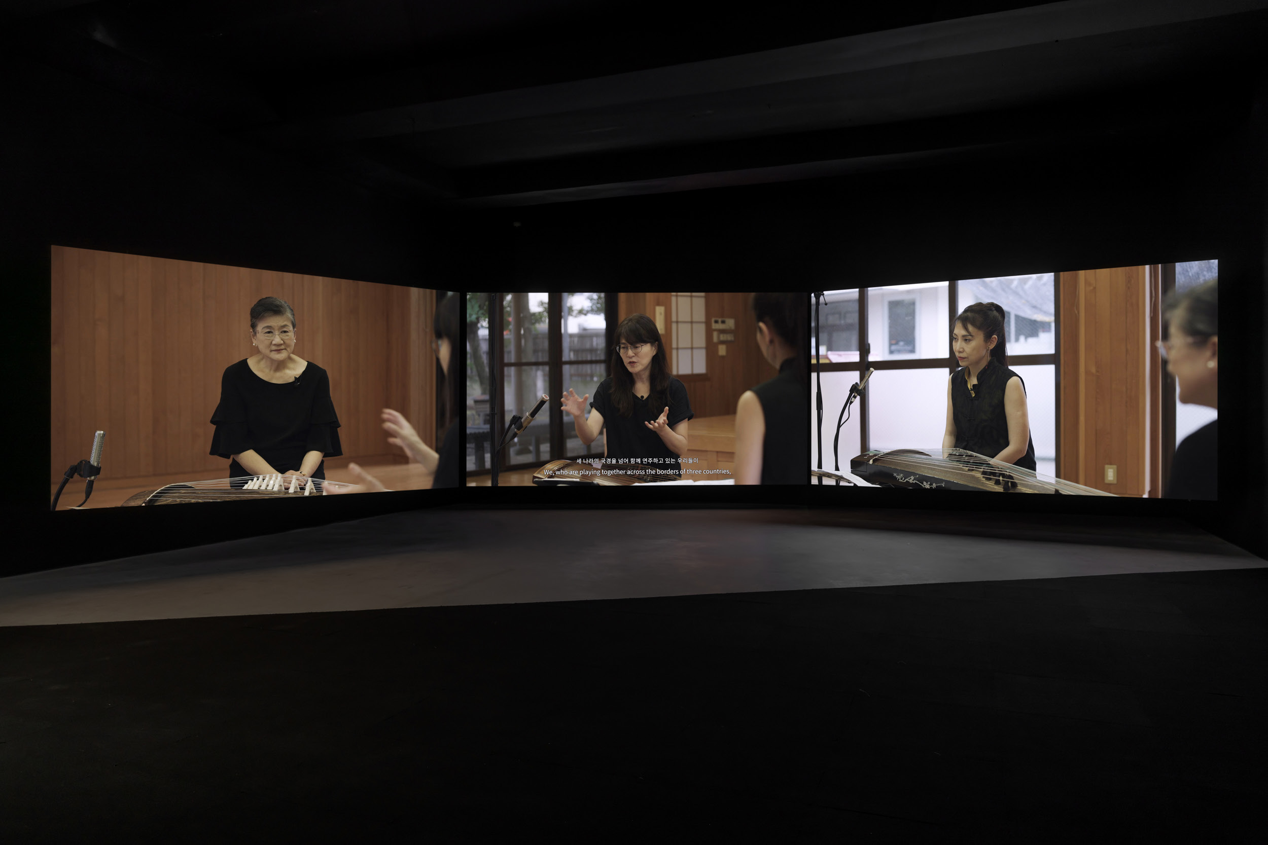 신작 영상 〈오버톤〉은 소리를 따라 남북을 가로질러 이동했던 가야금 연주자 박순아의 여정을 중심으로 한·중·일 아시아의 금(琴) 연주그룹
