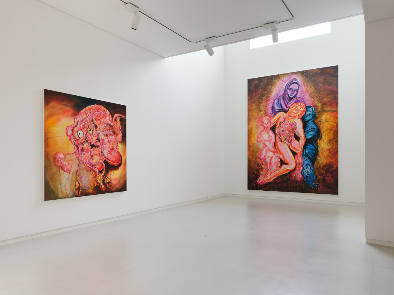 높이 2미터 중반의 대형 회화인 Triangle of Lamentation는 십자가에서 끌어내려지는 예수를 모티브로 하는 미켈 란젤로의 대리석 조각 <피에타 반디니 (Pieta Bandini)>를, 중형의 A Common Woman series는 아기 예수를 안고 있는 성모 마리아 도상을 인용한 것이다. 앞서의 맥락에서 작가의 ‘여성성’에 대한 관심이 개인을 넘어 보다 보편적인 영역으로 옮겨가고 있음을 알게 한다. 다른 한 편으로 회화적 질감이 한층 강조되고 있는 Mama series의 내장, 눈알, 태아 등이 한 데 뭉치거나 뒤섞여 쏟아지고 있는 장면은 기괴한 아름다움을 극대화한다.