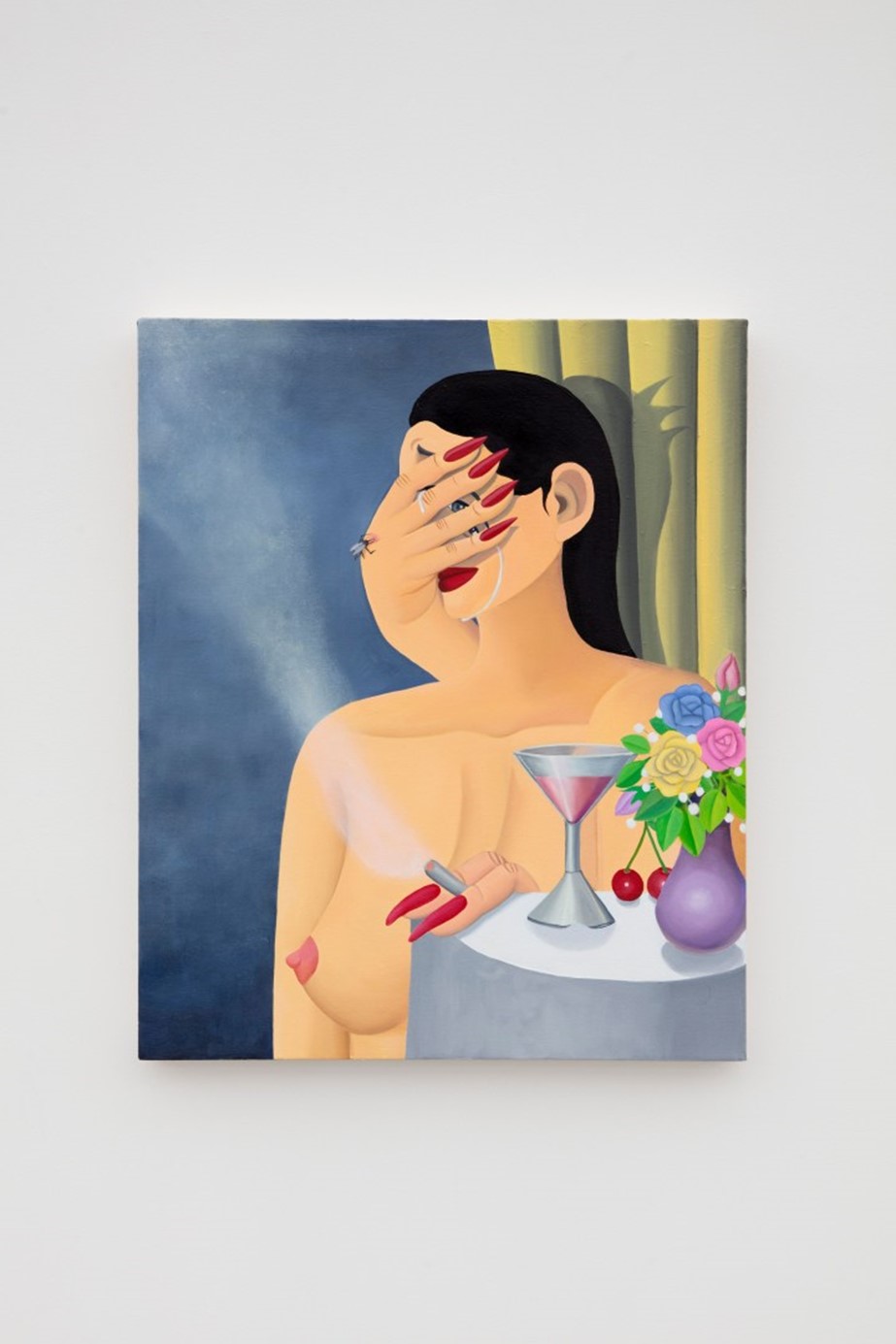 커튼을 드리웠다. 테이블 위에는 길고 날카로운 붉은 손톱을 칠한 두 개의 커다란 손가락이 놓여 있으며, 그 사이에는 담배가 끼워져 있다. 이 손가락들은 비례적으로 보았을
