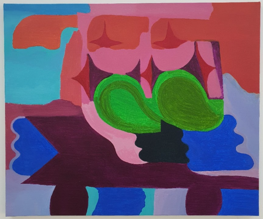 이동 중〉(Traveling between stairs, 2018) 등의 작품에서, 대상을 재현한 것은 아니지만 무언가를 연상시킴으로써 현실 근처에 있는 것처럼 보이는 형태들을 조형적 관계에